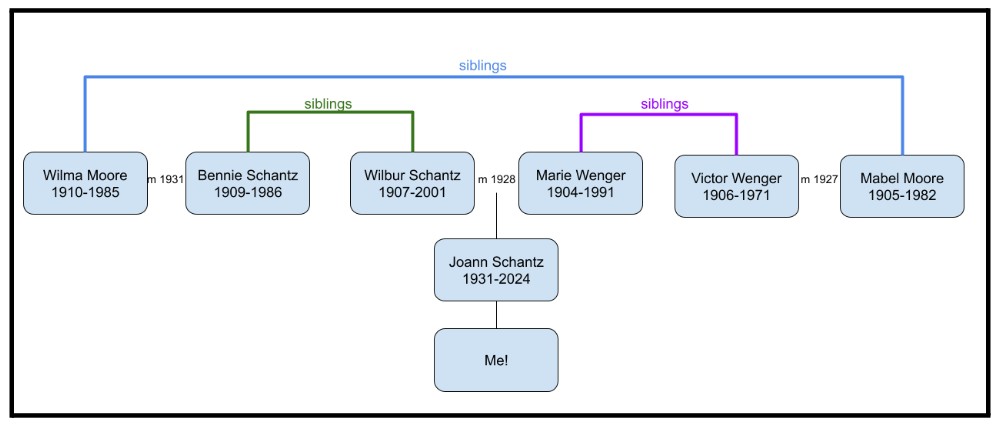 We have a unique double connection with Vic and Mabel. Vic was Marie’s brother. Mabel’s sister, Wilma Moore, married Wilbur Schantz’s brother Bennie Schantz.